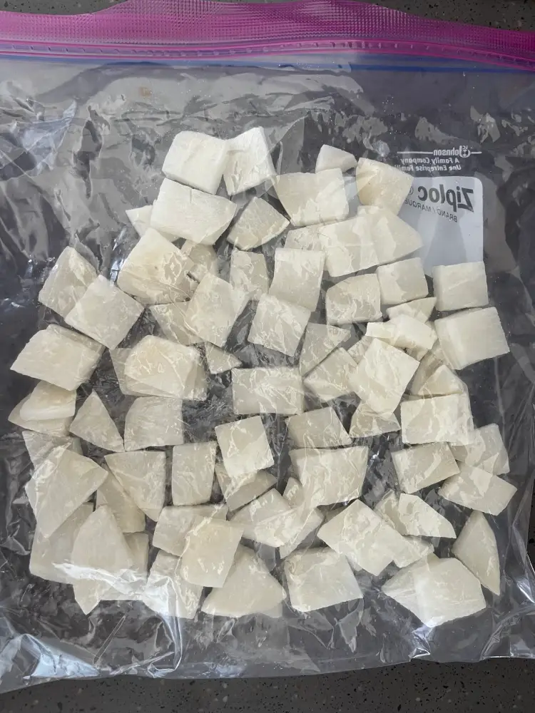 무를 냉동보관하기로 결정했다면 작은 조각으로 썰어주고 냉동보관이 가능한 비닐백에 넓게 펴서 넣어줍니다.